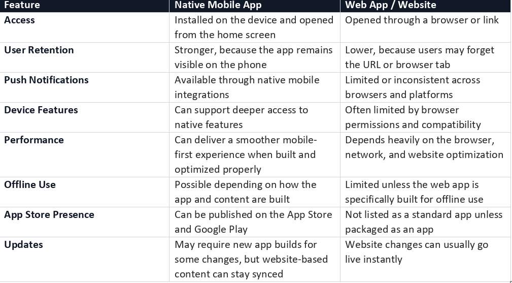 Web apps are flexible, accessible, and easy to update. They are still an important part of most digital businesses. But when your goal is to build stronger user engagement, increase repeat visits, improve mobile experience, and create a more permanent brand presence, a native mobile app offers clear advantages.